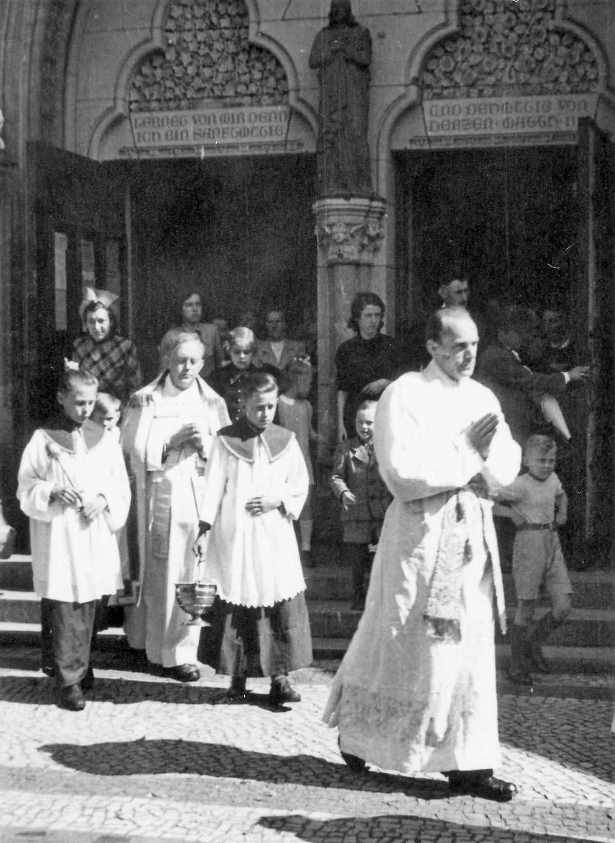 Es ist bemerkenswert, was Pfarrer Johannes Derksen in reichlich 13 Jahren seiner Tätigkeit in der Gemeinde (1949 -1963) bewirken konnte. Das Gemeindeleben musste in den Nachkriegsjahren völlig neu aufgebaut werden. Dafür kam ihm seine Gabe, ständig neue Ideen zu entwickeln und auch umzusetzen, zu Hilfe. Er schrieb eine Vielzahl von Mysterien-, Weihnachts- und Heiligenspiele, die von der Gemeindespielschar aufgeführt wurden. Seine unzähligen Romane werden heute noch gelesen und zum Teil auch neu veröffentlicht. Es war sein Verdienst, dass für die Dresdner Katholiken erstmals seit der Reformation öffentliche Fronleichnams- prozessionen im Großen Garten durchgeführt werden konnten. Anlässlich des 50-jährigen Bestehens der Herz-Jesu-Kirche ließ er diese umfassend renovieren. Er entwarf einen Themenzyklus für die Neuverglasung der Fenster, der durch den namhaften Künstler Prof. Bruno Seener in entsprechende Entwürfe umgesetzt wurde und auch heutzutage durch die Leuchtkraft der Farben große Beachtung findet.
