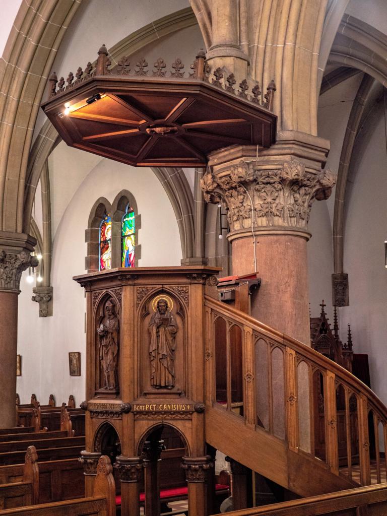 Mit fünf Heiligen, die durch ihre Predigten Zeugen des Glaubens waren, hat der Künstler Heinrich Hartmann im Auftrag der Firma Anton Becker 1916 die Kanzel geschmückt: