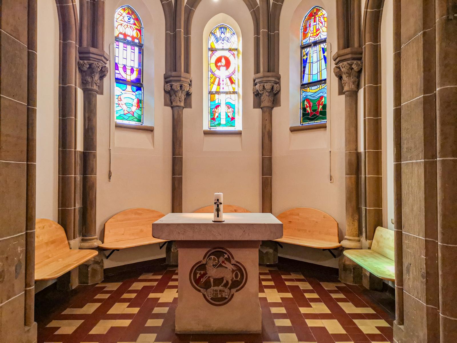 In der Kapelle (früher Taufkapelle) sind die Zeichen der Osternachtsfeier in drei Fenstern dargestellt: Osterkerze, dreiarmiger Leuchter und Taufkleid. Fischlein als Symbol der aus dem Wasser und dem Heiligen Geist wiedergeborenen Christen umspielen die Zeichen. Im oberen Teil Symbole, Gott Vater, Gott Sohn und Heiligen Geist bezeichnend.