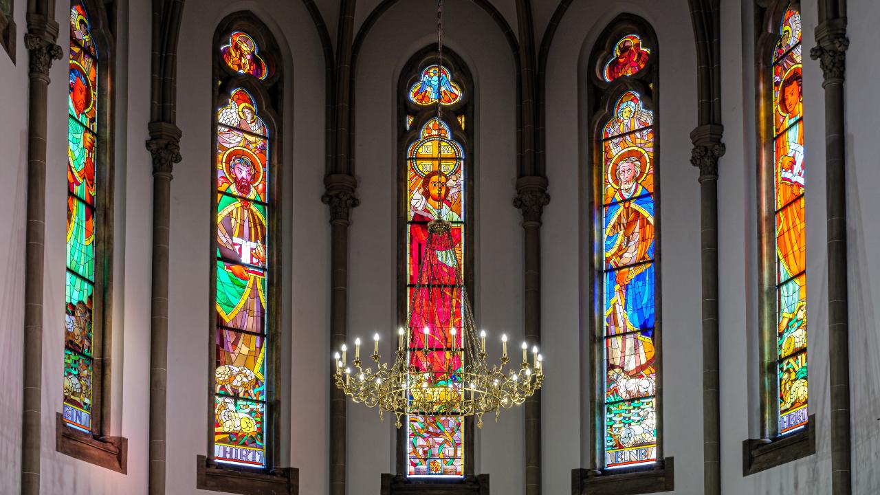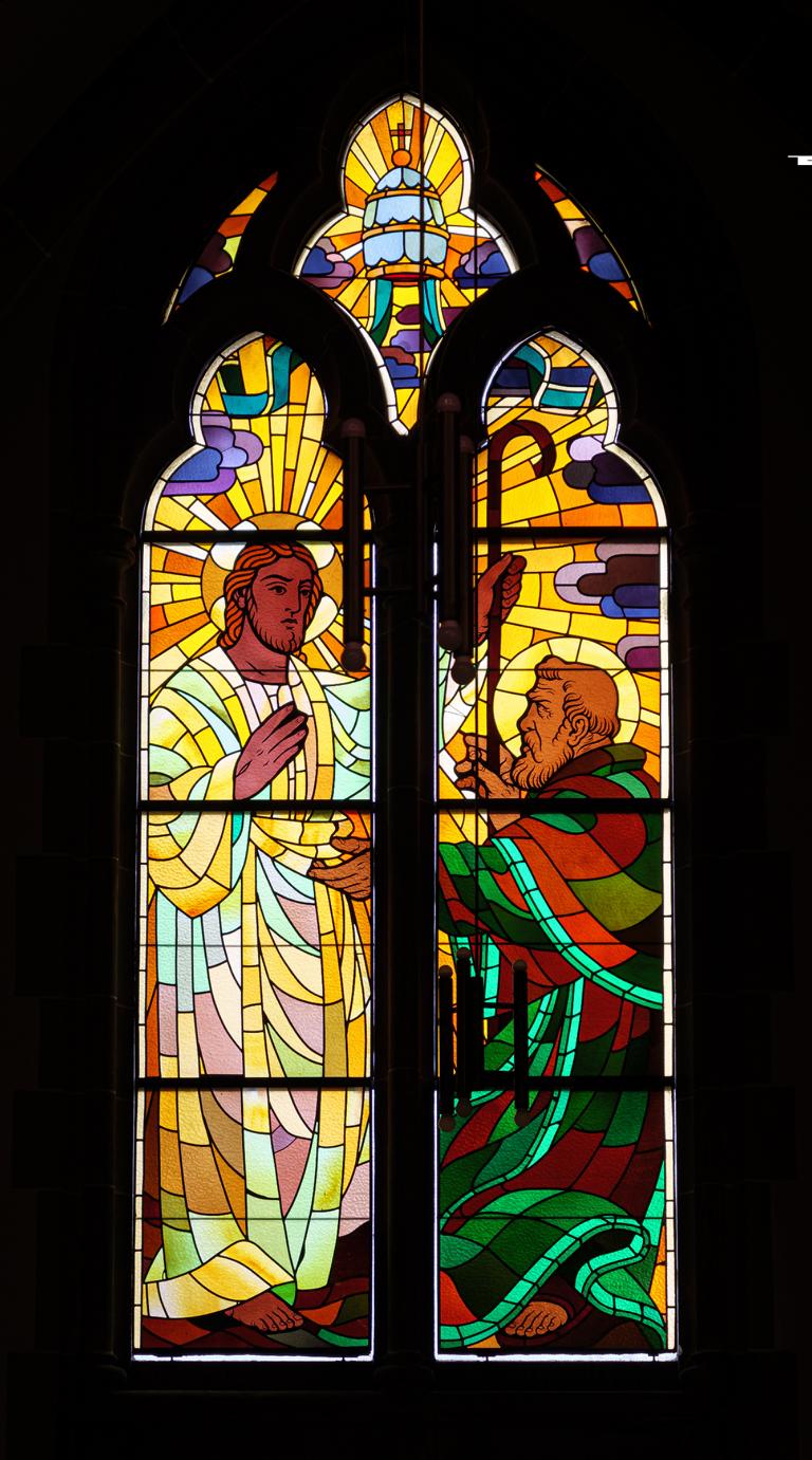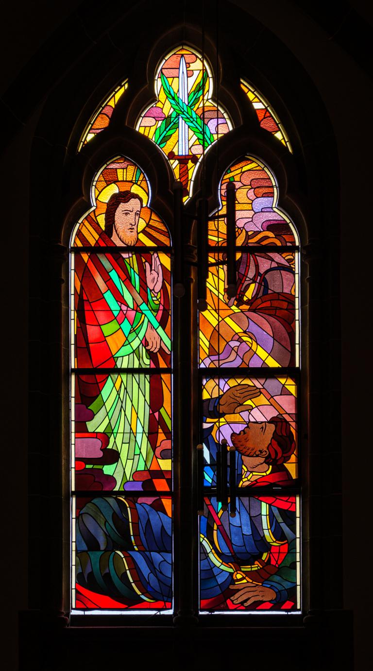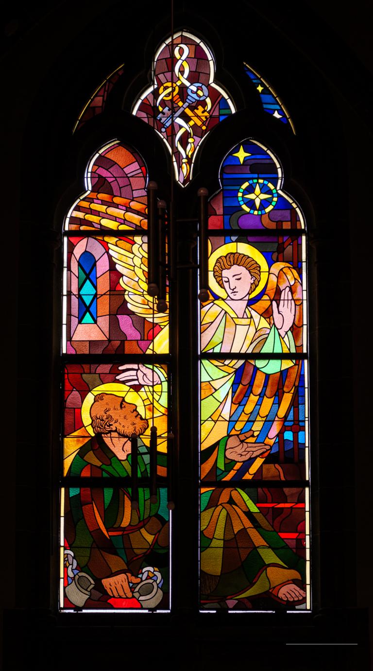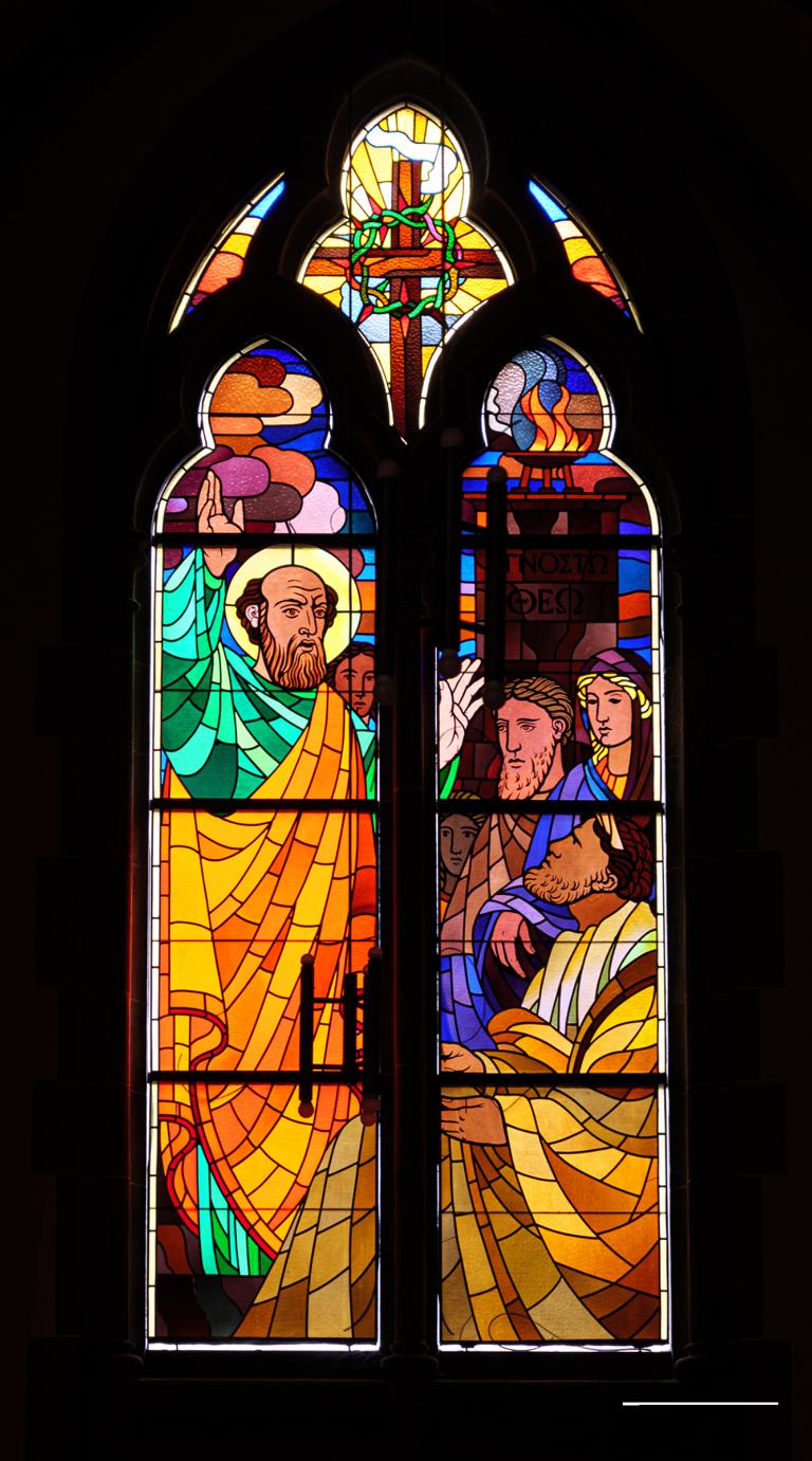 Die vier großen Fenster in den beiden Enden des Querschiffs zeigen die Apostelfürsten Petrus und Paulus. Beide sind sündige, durch Christus begnadete und erlöste Menschen, der eine zum Hirten, der andere zum Völkerlehrer berufen. Links Petrus im Gefängnis, wie ihn der lichte Bote Gottes befreit, so dass die Ketten abfallen; darüber das Symbol der Binde- und Lösegewalt. Daneben die Begnadigung und Beauftragung durch Christus:"Weide meine Lämmer, weide meine Schafe!" Darüber das Symbol der die Einheit der Kirche garantierenden Papstgewalt: die Papstkrone Tiara. Auf der rechten Seite die Bekehrung des Christenverfolgers Saulus mit dem Symbol des Schwertes. Daneben im glühenden Gewande, so dass die Seitenkapelle davon widerstrahlt: Paulus predigt in Athen auf dem Areopag vor dem Altar des unbekannten Gottes. Zu seinen Füßen sitzt der Areopagit Dionys; er breitet seine Hände empfangsbereit für die Frohbotschaft aus. Neben ihm steht die schon gläubig gewordene Damaris, erkennbar am Rot der Gnadenliebe, die sie empfangen hat.