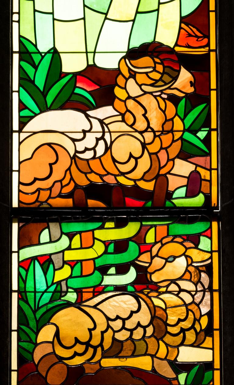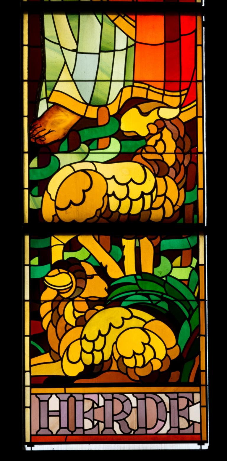Bei der Vierzahl der anderen Fenster im Altarraum lag es nahe, die vier Evangelisten zu wählen. So stehen sie denn von links nach rechts mit ihren vom Heiligen Geist inspirierten Büchern da: Matthäus, Markus, Lukas und Johannes. In dem Dreipass hoch oben sind die Symbole der Evangelisten abgebildet: der Mensch, der Löwe, der Stier und der Adler. Zu Füßen der Christuskünder findet man wiederholt das Schafmotiv: sie führen durch ihre Botschaft die Schafe zu Christus. Gleichzeitig wird aber durch die zwei Schafe trennende Hürde das große Leid der Christenheit ehrlich dargestellt. Hoffnung gibt aber das Fenster ganz rechts, bei welchem das Gatter nicht mehr trennend vorhanden ist. (Ökumenische Vision deiner verbundenen Kirche? A.dR.)