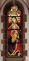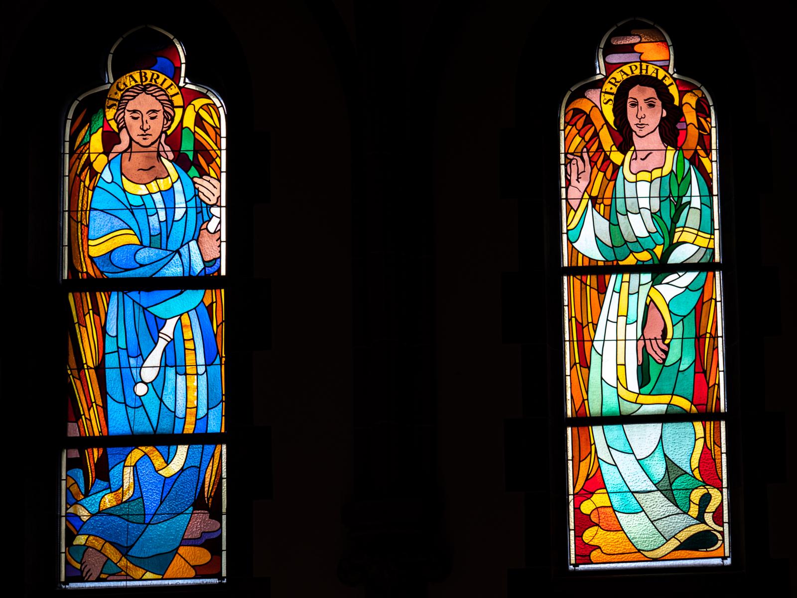 In den Oberfenstern im Altarraum bilden je drei Gestalten eine Einheit. Rechts oben der Erzengel Michael mit der Waage. Links der Erzengel Raphael und der Erzengel Gabriel mit dem Heroldsstab.
