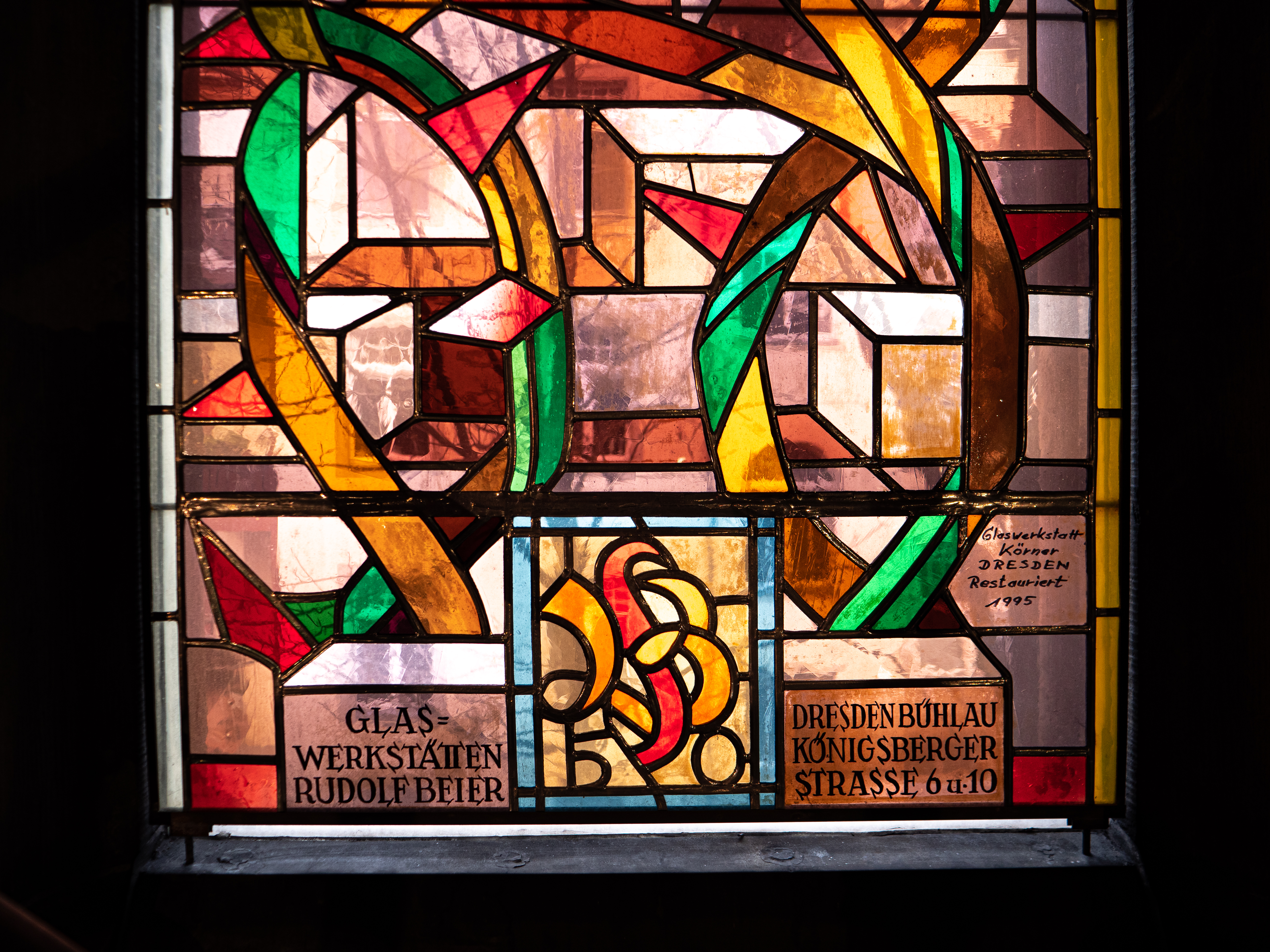 Über der Tür zur Straße ein Fenster mit dem Weltenrichter.