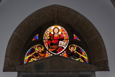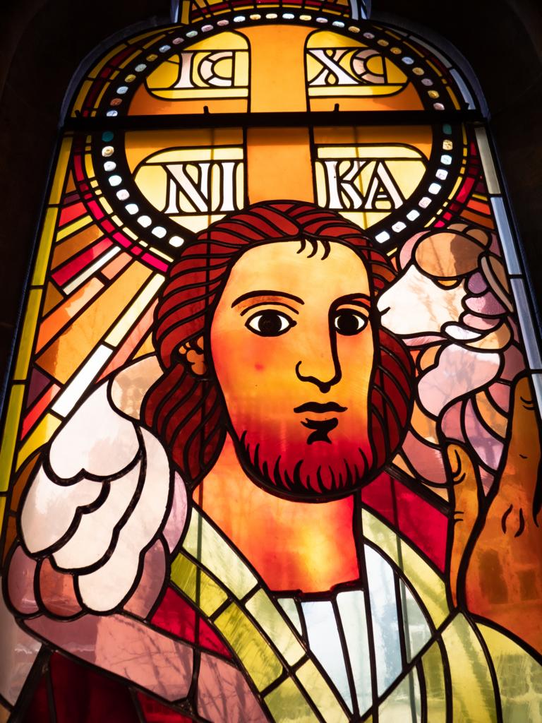 Betreten wir die Kirche, so steht im Altarraum gewaltig und majestätisch das Christusbild des Guten Hirten vor uns. Im rubinroten, mit seinem Blut getränkten Gewande steht der Herr da, den Stab in der Hand. Er kommt vom Kampf mit dem Wolf und seine Siegestrophäe ist das Lamm, das er auf den Schultern trägt und das ihn dankbar küsst. Er ist bereit, die anderen Schafe, die noch unter den Dornen und Trümmern ihres sündigen Menschseins liegen, ebenso auf seine Schultern zu nehmen und zum Vater zu bringen. Hoch über der Christusgestalt mit dem Strahlenkreis des Siegers ist der Heilige Geist in Gestalt einer Taube mit sieben Feuerflammen dargestellt.