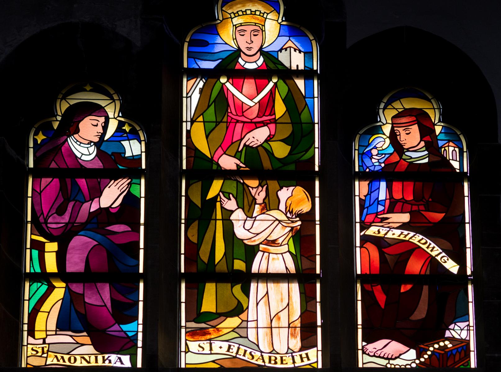 Die Fenster auf der rechten Seite beginnen hinter den kleinen Engeln. Die drei Frauen: Elisabeth von Thüringen, die Wohltäterin der Armen; Monika, die für ihren sündigen Sohn betende und büßende Mutter, und Hedwig mit der Madonna und dem Kloster Trebnitz.Das nächste Fenster zeigt drei Ordensgründer: Augustinus, vor ihm der Knabe, der das Meer in ein Becken schöpfen will. Augustinus erkannte an diesem Tun, dass es unmöglich sei, das Geheimnis des gewaltigen Gottes mit irdischem Verstand ermessen zu wollen. Der Mönchsvater Benedikt mit dem in speisenden Raben, und Franziskus mit den Tieren. Das letzte rechte Fenster: Theresia vom Kinde Jesu, die das Buch "Geschichte einer Seele" schrieb und versprach, vom Himmel Rosen regnen zu lassen (d.h. himmlische Wohltaten zu erflehen); Gertrud von Helfta, die das Buch "Von der göttlichen Liebe", und Hildegard von Bingen, die das Buch "Scivias Domini" (Wisse die Wege des Herrn) schrieb.