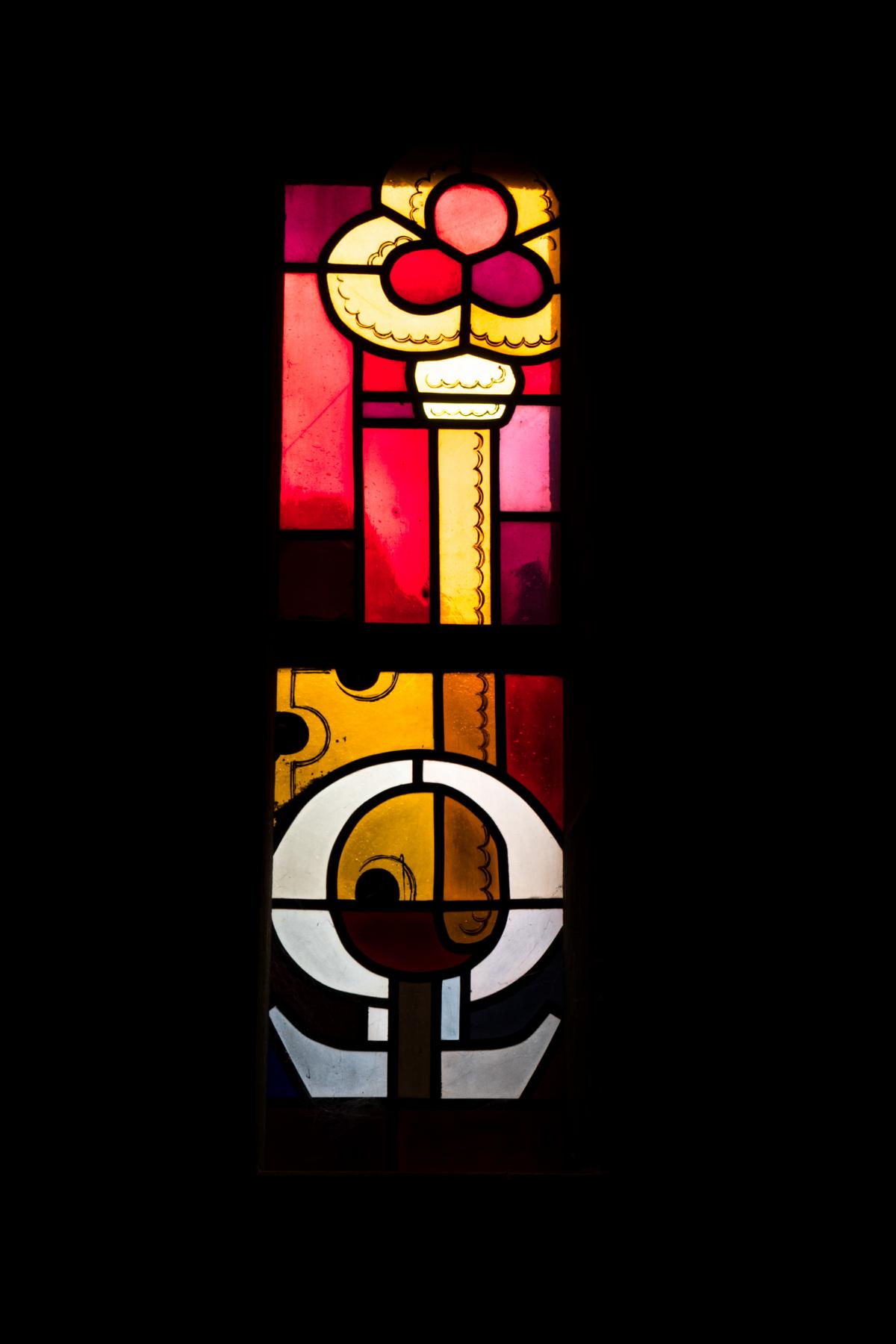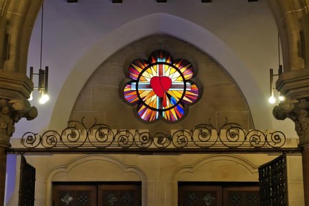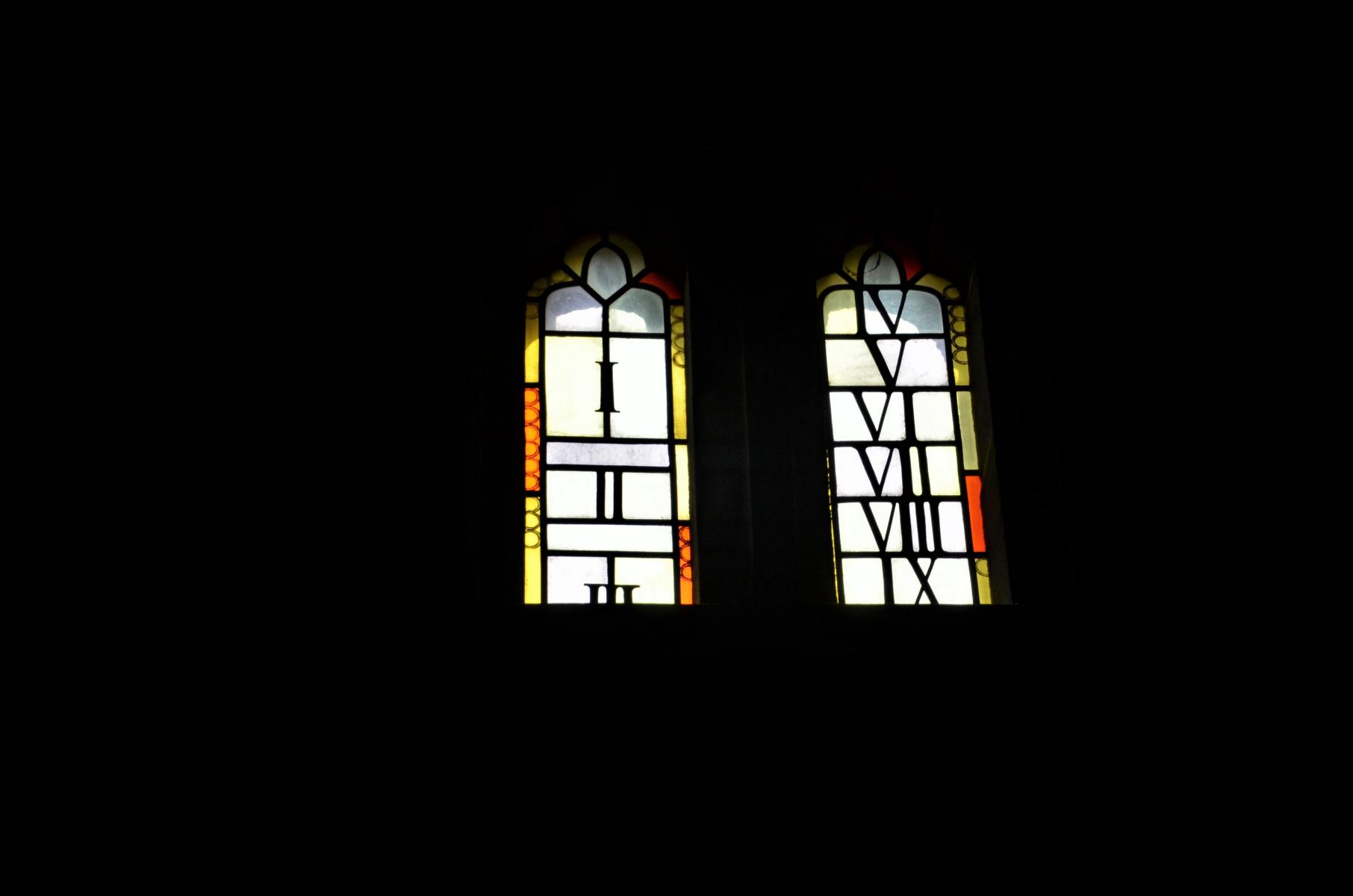 Über dem Eingang das Herz-Jesu-Fenster. Über dem kleinen Ausgangstor ein Fenster: Die zehn Gebote, und rechts und links vom großen Portal je ein Fenster mit einem Schlüssel. Sie deuten, dass Christus der Gesetzlehrer und Schlüsselgewaltige der Zeit ist.