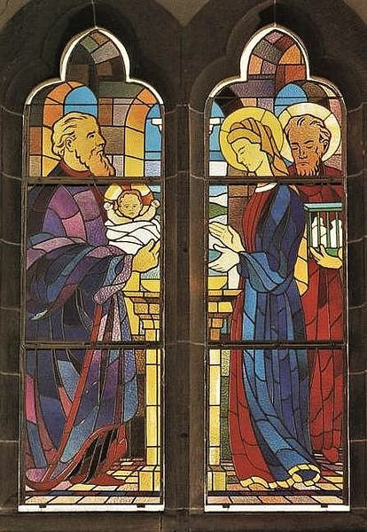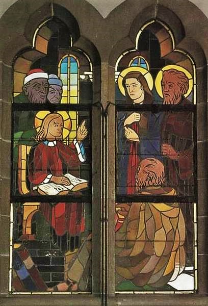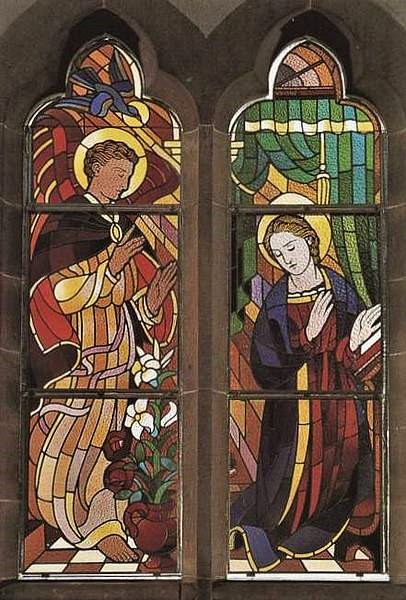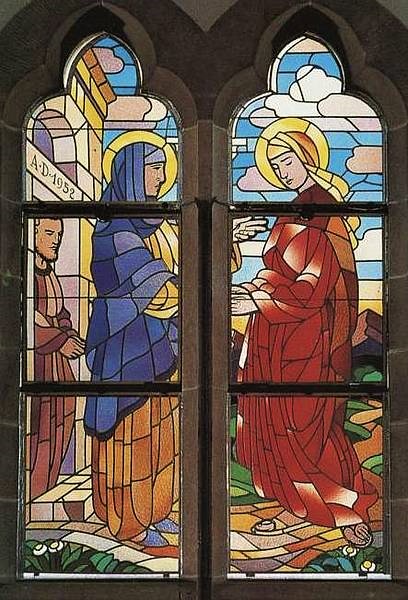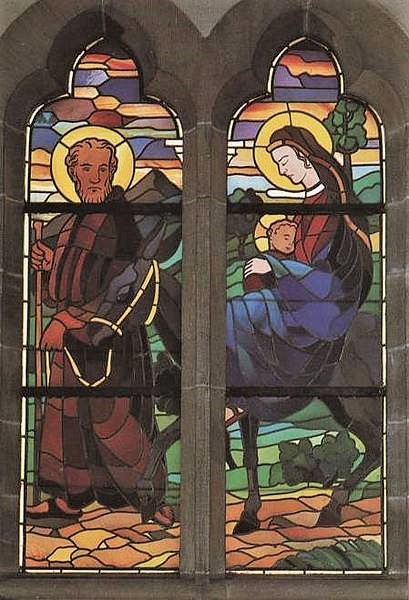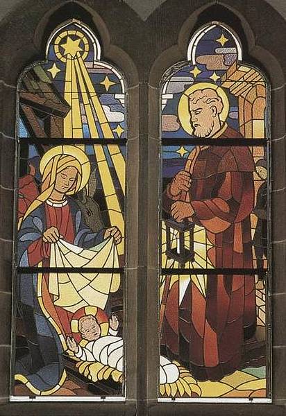 Im linken Seitenschiff beginnt ein Rundgang mit Bildern aus der Heiligen Schrift. Die heilige Siebenzahl ist ausgewählt und kündet uns von der innigen Verbindung des Gottmenschen mit seiner Mutter Maria. Das erste Bild enthält die Szene, wo der Erzengel Gabriel majestätisch und ehrfurchtsvoll der Jungfrau Maria die Frohbotschaft bringt: Mariä Verkündigung. Das zweite Bild zeigt die Begegnung Marias mit Elisabeth vor dem Haus des stummgewordenen Zacharias, Mariä Heimsuchung genannt. Das nächste ist das Weihnachtsfenster mit Christi Geburt. Die Mutter Gottes deutet auf seine ganze Menschlichkeit, indem sie ehrfürchtig uns die Windel entgegenhält. Aus der Spitze des Kleeblattfensters bricht der gewaltige Strahl des Sternes auf und kündet die Geburt des Gottessohnes. Hinter dem schmiedeeisernen Gitter befindet sich das Fenster mit der Darstellung Jesu im Tempel. Geschickt hat der Künstler durch ein Band, das sich um beide Fensterteile schlingt, diese zu einer Einheit verbunden, wobei die Mitte hier als Säule erscheint. Die drei Fenster im rechten Seitenschiff, in denen die Flucht nach Ãgypten, der zwölfjährige Jesus im Tempel und die Hochzeit zu Kana dargestellt sind, vervollständigen den Zyklus der Marienfenster.