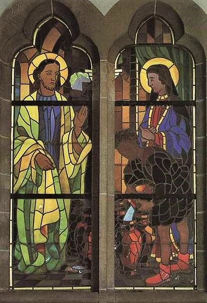 Das nächste Fenster zeigt drei jugendliche Martyrinnen: die mit dem Schwert enthauptete Barbara, Patronin aller, die im Turm oder im Bergwerk arbeiten müssen; wir erkennen rechts oben einen Förderturm. Links von dieser Heiligen Agnes mit dem Lamm. Rechts: Maria Goretti, die jugendliche Martyrin unserer Tage aus Italien. Kniend ihr Mörder, der sich bekehrte und als Büßer lebte.