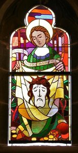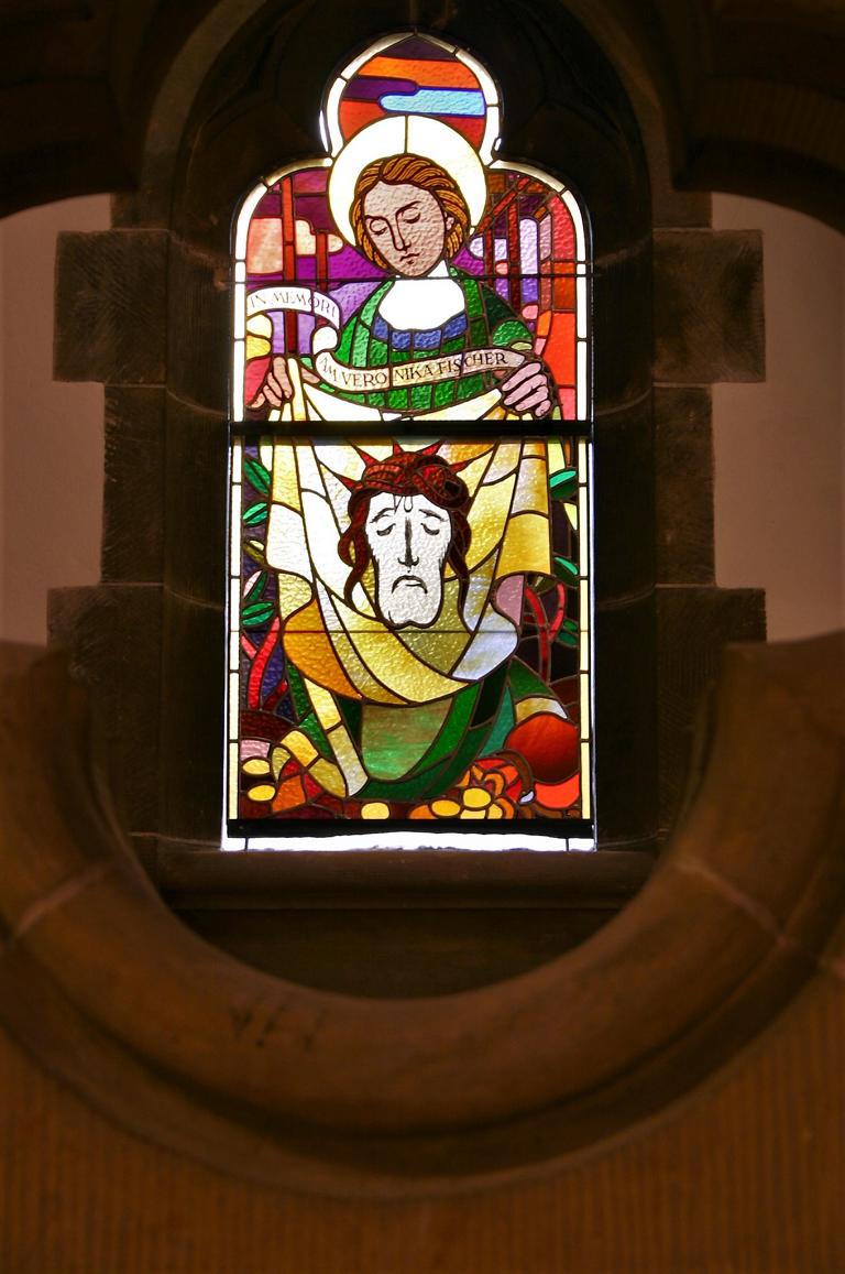 Einige kleinere Fenster sind noch zu beachten: Auf der linken Seite am Sakramentsaltar das Veronica-Fenster. Veronika reichte nach der Legende dem Herrn auf seinem Kreuzweg das Schweißtuch, auf dem Jesus sein Antlitz zurückließ als Dank für die mutige Liebestat. Dieses Fenster wurde zu Ehren der großen Wohltäterin Frau Veronica Fischer eingesetzt, die 1905 zweihunderttausend Goldmark zum Bau der Kirche gab. Im Hintergrund des Fensters ist ein Baugerüst zu erkennen.