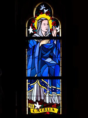 Das letzte linke Fenster, vor der Orgelempore, weist auf die bischöflichen Glaubensboten: Bonifatius, Apostel der Deutschen, Benno von Meißen und Norbert von Magdeburg. Auf der Orgelempore sodann die singende Cäcilia als Patronin des Kirchengesanges und der Kirchenmusik.