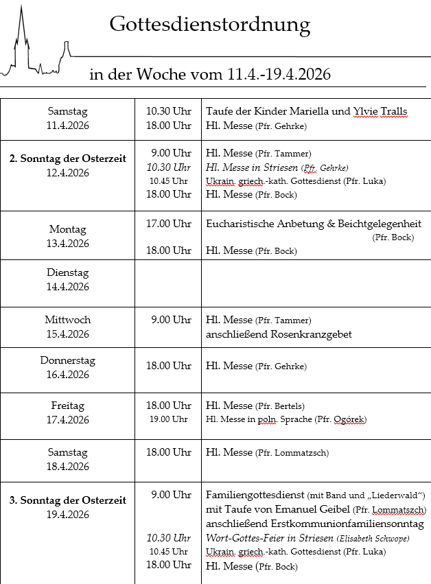 Die Kollekte am heutigen Sonntag wird für die Aufgaben der Gemeinde erbeten. Unter dem Motto „Wir. Zusammen!“ findet vom 11. -20.4. die Caritas-Straßensammlung statt. Dafür werden noch Sammler gesucht. Rückmeldungen bitte an das Pfarrbüro.