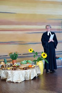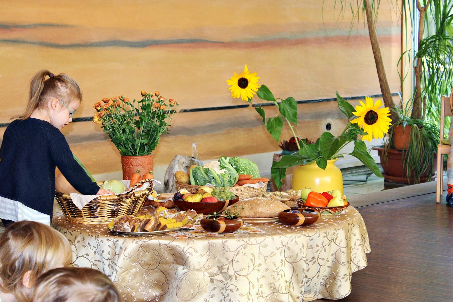 Ende September feierten wir mit den Kindern im Kinderhaus das Erntedankfest. An diesem Tag versammelten wir uns alle im Foyer zu einer Katechese. Nachdem einige Kinder für uns das Märchen „Das Rübchen“ gespielt hatten, segnete Pfarrerin Knepper, die mit in unserer Runde war, unseren reichlich gedeckten Erntetisch. Im Anschluss daran konnten die Kinder das Brot, welches am Vortag gemeinsam gebacken wurde, verkosten.