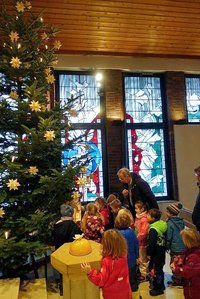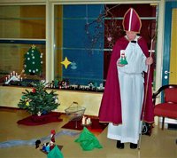 An unserem Nikolaustag hatten wir auch in diesem Jahr wieder Besuch. Ins Kinderhaus kam aber nicht der Nikolaus, sondern unser Pfarrer Gehrke, der den Kindern vom Leben des Bischof Nikolaus erzählte und sich dann LIVE verkleidete und so den Kindern berichtete , was alles zu einem Bischof dazu gehört . Unter anderem das weiße Gewand der Taufe – was alle Getauften tragen – das Gewand des Priesters und das Erkennungszeichen des Bischofs, die Mitra und den Hirtenstab, der von der Verantwortung für die Herde Gottes zeugt. Von Verantwortung für Andere hatte auch die Geschichte zu tun, die den Kindern erzählt wurde, wie der Bischof Nikolaus für drei Töchter mit Hilfe heimlicher Geschenke (Goldene Äpfel oder waren es Kugeln?) die Hochzeit ermöglichte und so neue Hoffnung brachte. So sind bis heute am (grünen -Farbe der Hoffnung) Weihnachtsbaum, die Verbindung zu unserem Adventsthema, Äpfel oder Kugeln zu finden. Natürlich gab es dann auch einen kleinen Nikolaus im Tannenwald für die Kinder mit nach Hause. Wir danken allen Bastlern und Vorbereitern.