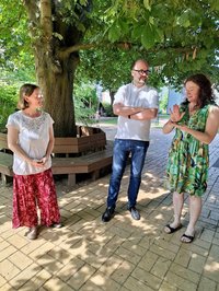 Eine Hausführung zur Begrüßung führte zu einem ersten Austausch über konzeptionelle Gedanken mit Kinderhausleiter Marco Körner. Als einen festen Bestandteil erlebte Herr Piwarz anschließend den täglich stattfindenden Morgenkreis mit unseren pädagogischen Fachkräften Heike Köth und Gregor Hirschmann. Hier wurde mit dem Einsatz von Instrumenten gesungen und das Thema Freundschaft vertieft. Zur Veranschaulichung diente die Geschichte von Strandbär und Lilou, einem ungleichen Paar, das Anderssein als etwas Wertvolles vermittelt.