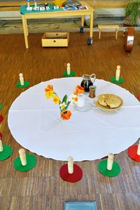 Eingebettet war die Geschichte von den individuellen Adventswegen in den einzelnen Gruppen. Jeden Morgen wurde eine zusätzliche Kerze im kleinen Morgenkreis entzündet, die Maria und Josef auf ihrem Weg hin zur Krippe begleitete.